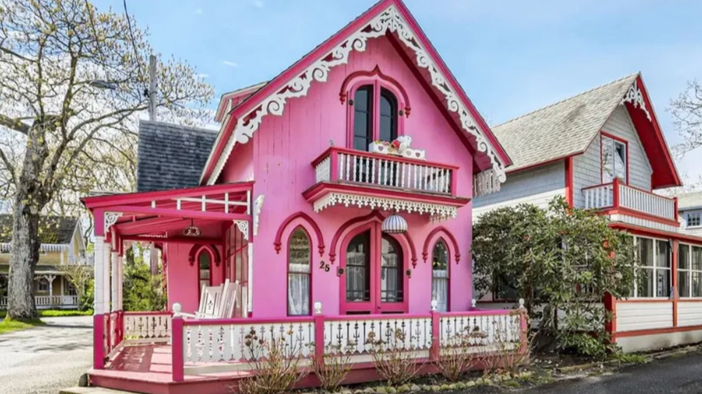 В США выставили на продажу домик, очень напоминающий кукольный. Само помещение, как снаружи, так и внутри, окрашено в белые и розовые цвета.