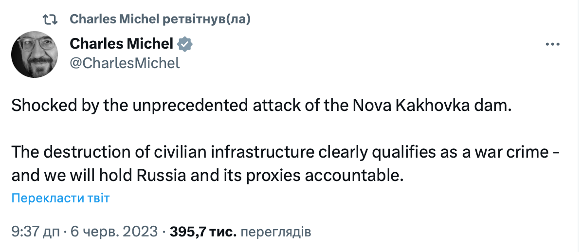"Шокований безпрецедентним обстрілом дамби Нової Каховки. Знищення цивільної інфраструктури однозначно кваліфікується як військовий злочин, і ми притягнемо Росію та її ставлеників до відповідальності", — написав Мішель.