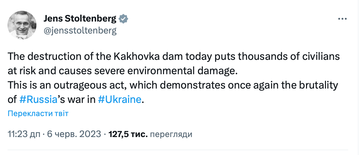 Генсек НАТО Єнс Столтенберг заяви, що "руйнування Каховської дамби сьогодні ставить під загрозу життя тисяч мирних жителів і завдає серйозної шкоди довкіллю. Це обурливий акт, який ще раз демонструє жорстокість війни Росії в Україні".